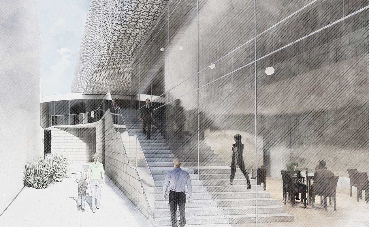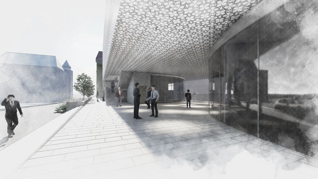 Der Neubau (umfasst auch eine Tiefgarage) sollte als kompakter, zweigeschoßiger Baukörper in Erscheinung treten, der über einem transparenten, durchgängigen Sockelbaukörper schwebt. Die Baukörperhöhe des Neubaus orientiert an der Attikahöhe des historischen Bestandsgebäudes und ist von diesem wesentlich abgerückt, um die Baumasse des historischen Hauptgebäudes größtmöglich aufzuwerten. Transparente Übergänge vom Neubau zum historischen Hauptgebäude (horizontal, vertikal) sollten die Solitärstellung des Hauptgebäudes noch deutlicher zum Ausdruck bringen.